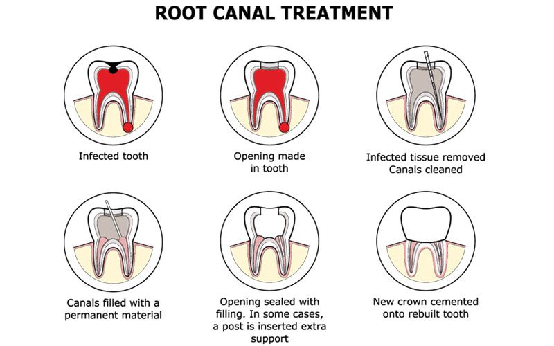 Each canal is cleaned and shaped, antibacterial medicine will be placed in each canal to help stop the infection, if a severe abscess has formed at the root tip oral antibiotics may also be given.